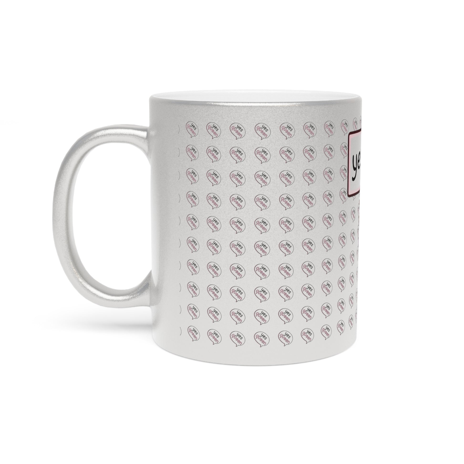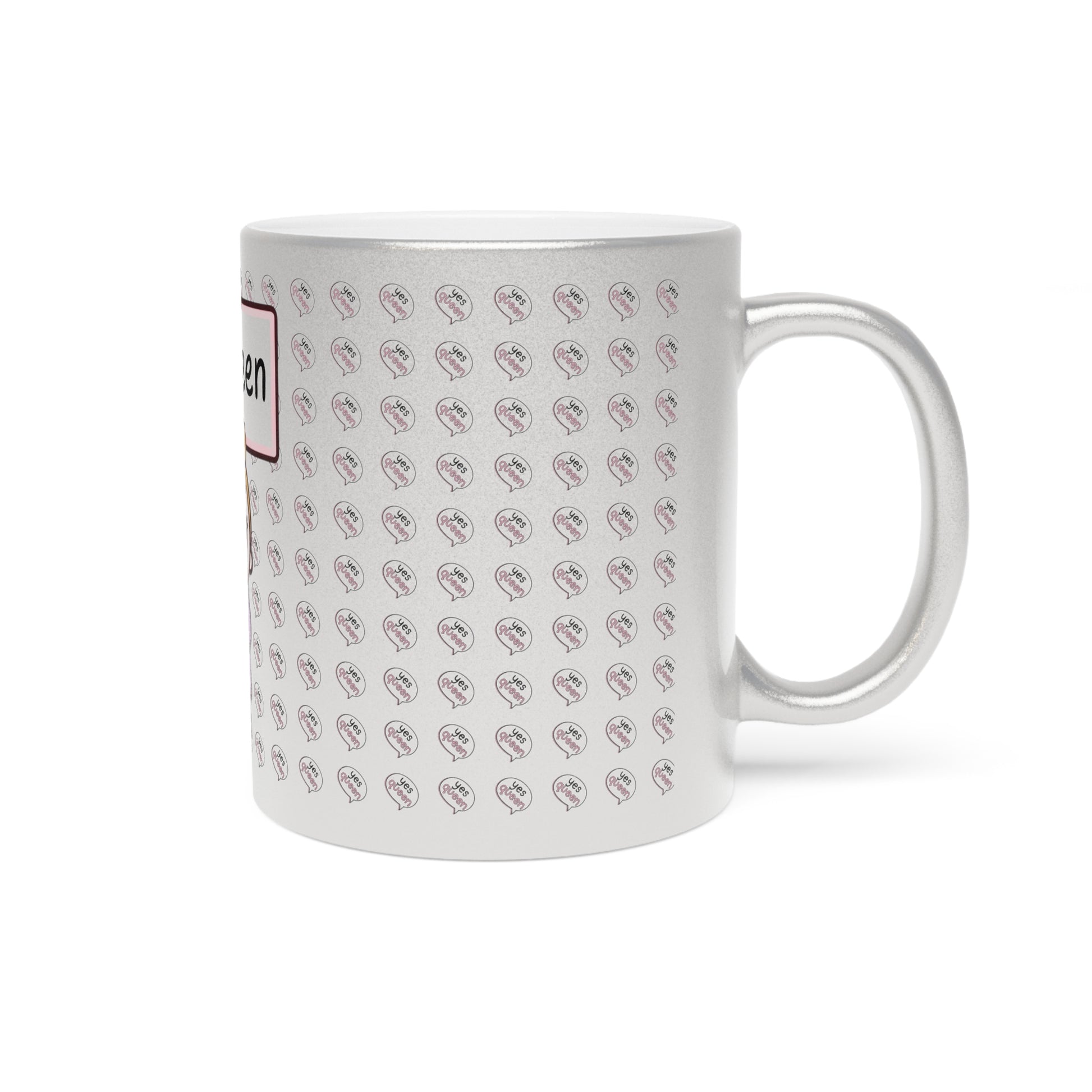 Shimmering and playful, this 11oz metallic mug brings a little cheer to everyday sips. The glossy silver or gold ceramic finish catches light and adds a subtle sparkle to your morning coffee, tea, or cocoa. A sweet, cartoon character holds a sign that reads “yes, queen,” surrounded by a repeat pattern that adds charm without overwhelming the design. Lightweight and bright, the C-handle sits comfortably in hand while the metallic coating gives each drink a stylish lift. Because the coating can be slightly translucent with lighter colors, the illustration’s soft pastels show a delicate, iridescent effect on the surface—an understated way to celebrate someone who loves cute, confident vibes.