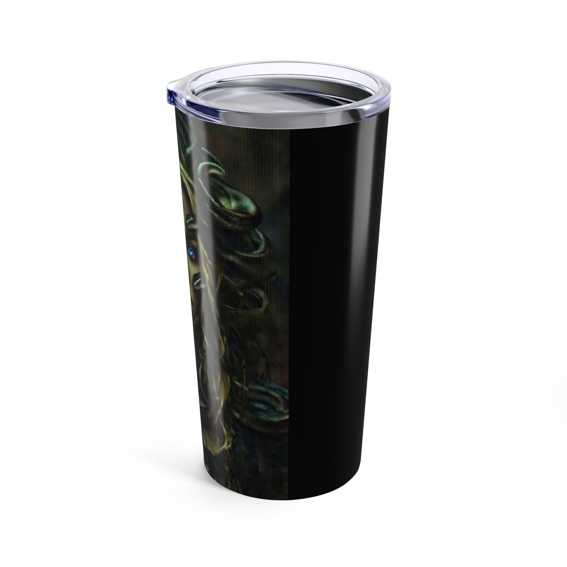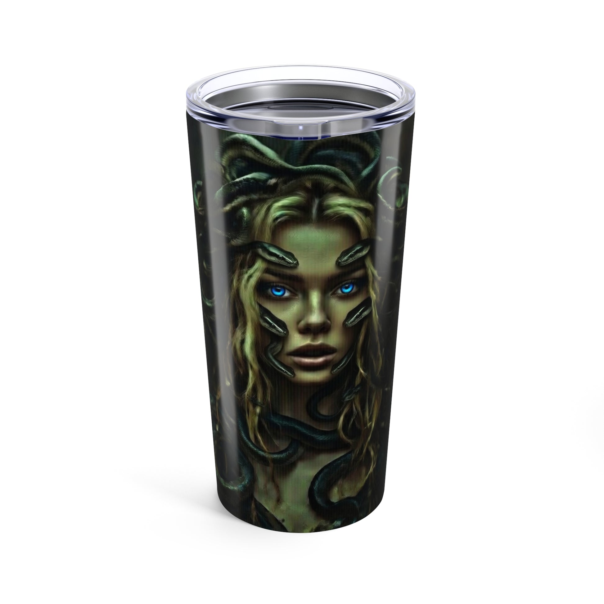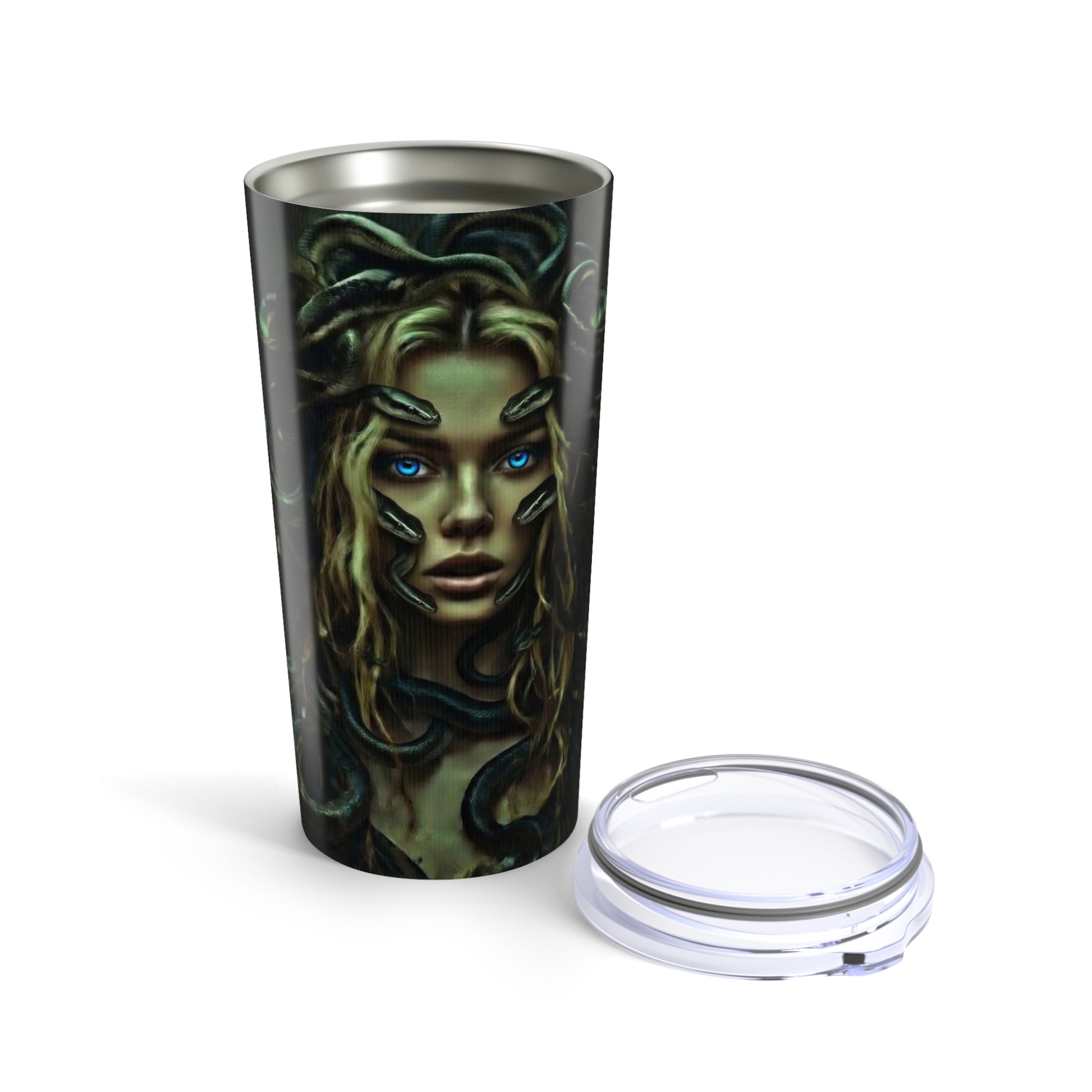 This 20oz stainless steel tumbler carries a dark, mythic energy — a glossy wraparound print of a Medusa-like face and coiling serpents that draws the eye and starts conversations. The vacuum-insulated steel body locks in temperature so coffee stays hot on a long commute and iced drinks stay chilled through afternoon errands. The clear push-on lid with a rubber gasket keeps splashes at bay while the rounded corners and smooth glossy finish make it comfortable to hold and easy to clean. It’s built to travel with you: rust-resistant, dishwasher-safe, and finished in a rich full-color print that won’t fade under daily use.
