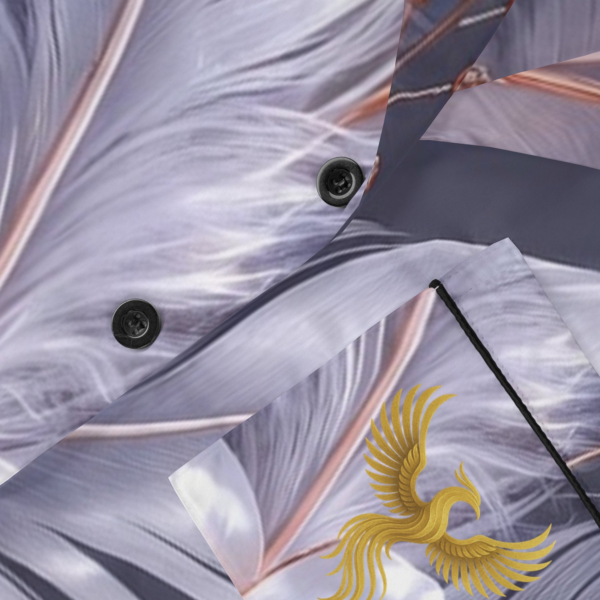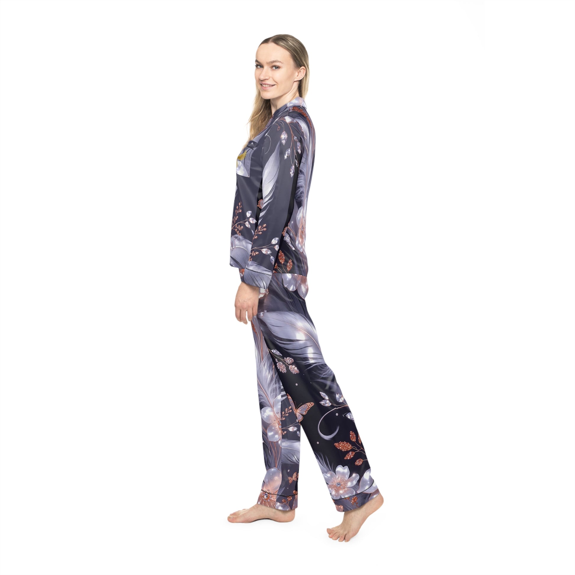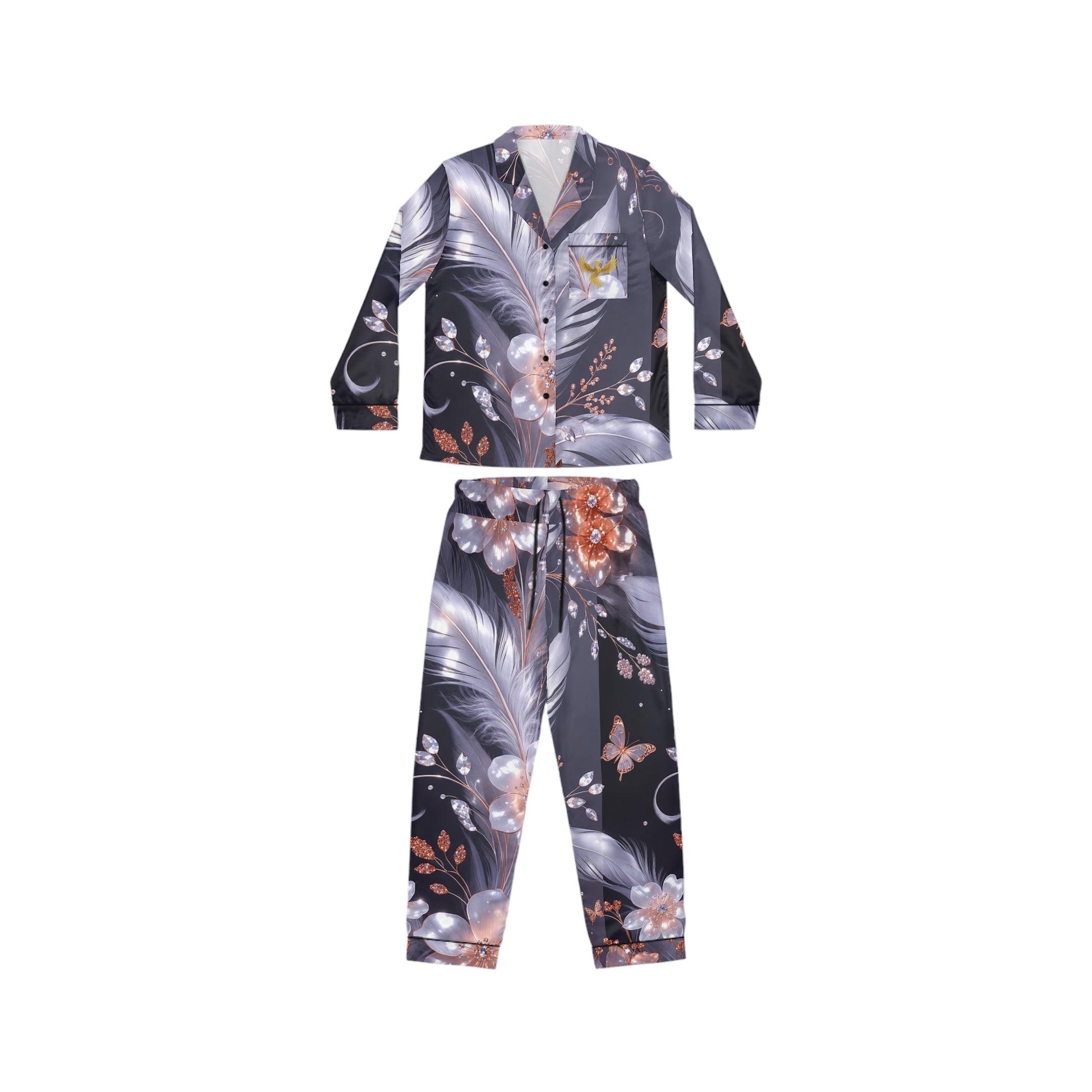 Slide into quiet luxury with these satin pajamas — a soft, drapey set that feels like a private evening ritual. The charcoal background, brushed silver feathers, and warm copper florals move across the fabric like a soft night breeze. Lightweight satin skims the skin and the adjustable drawstring lets you set the fit for lounging, reading by lamplight, or slipping into sleep. Classic notch lapels and button details give the top a timeless, slightly tailored silhouette, while the matched seam thread and optional black trim keep the look refined. These pajamas turn ordinary nights into something gentle and considered.