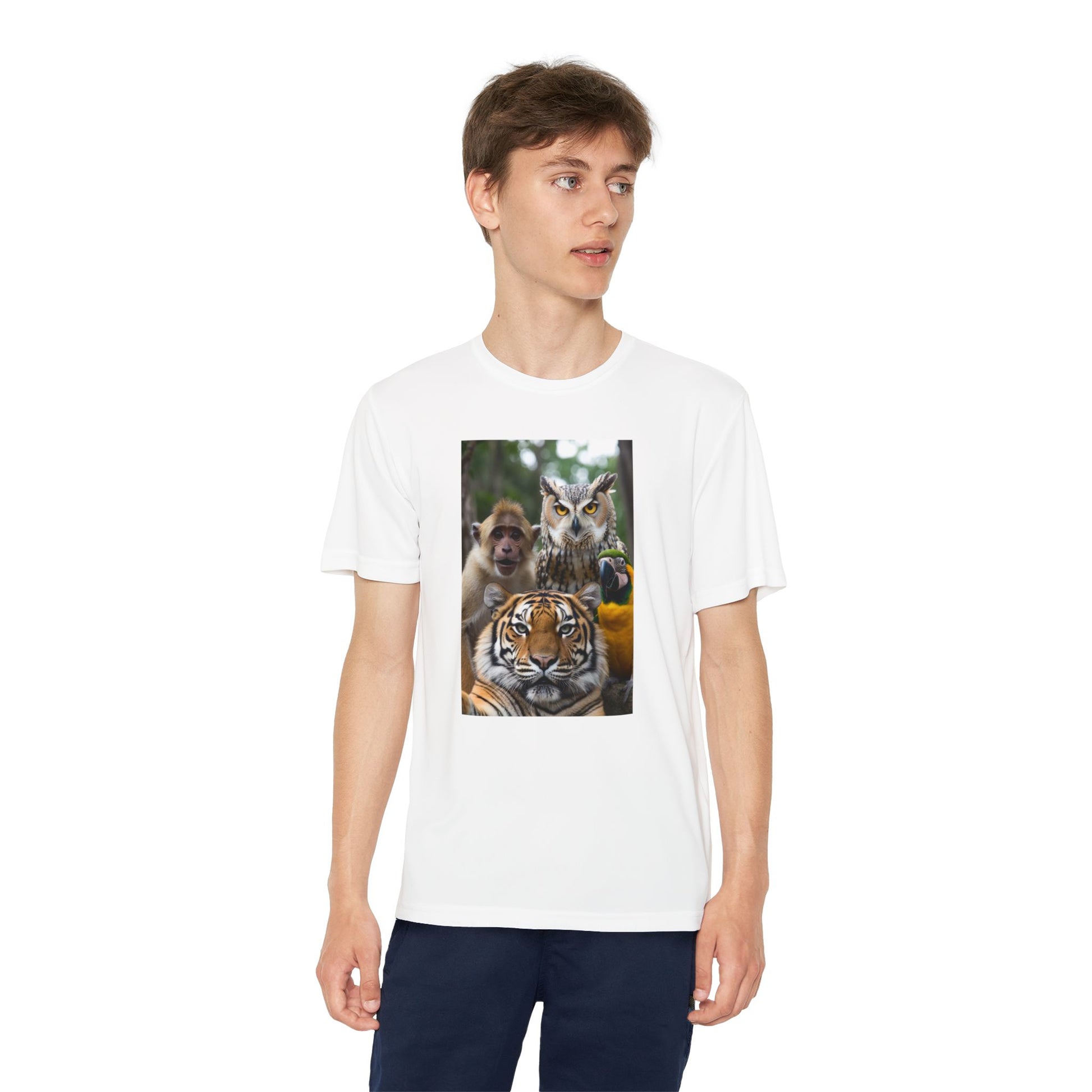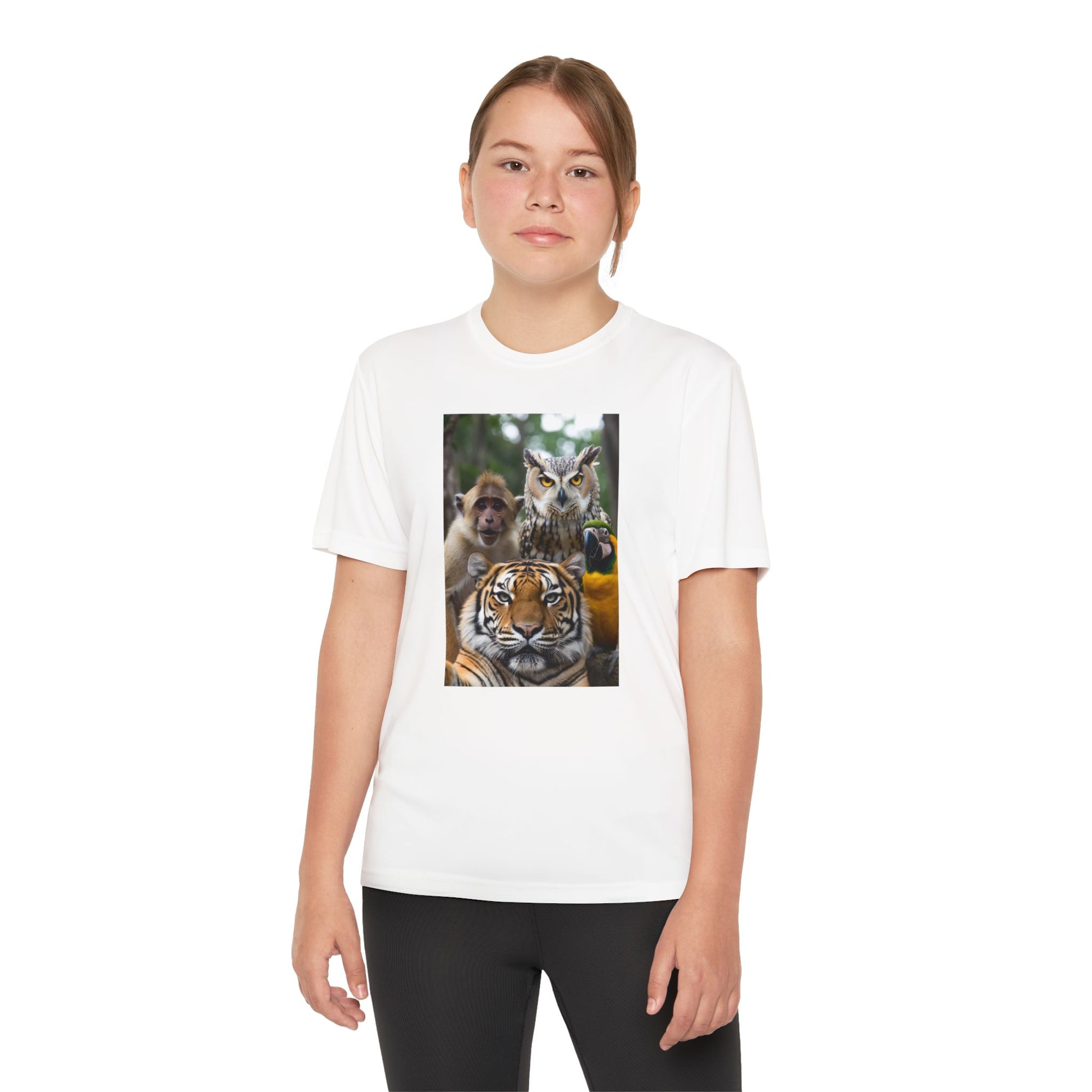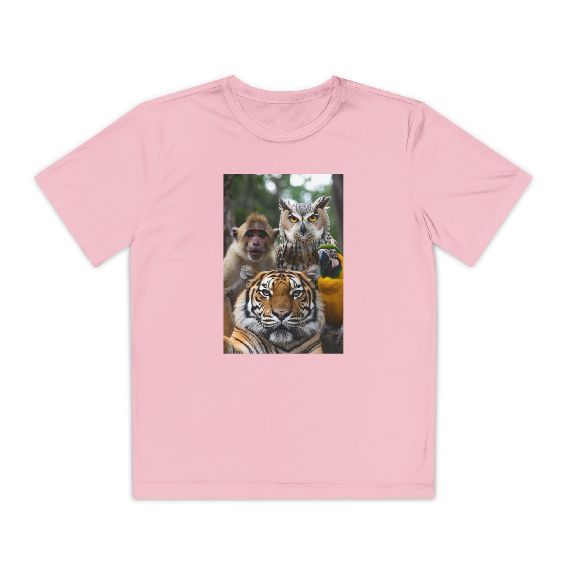 Bring playful jungle energy to their active days with this lightweight athletic tee. Breathable, moisture-wicking polyester keeps kids cool during practices and backyard adventures, while the vibrant DTF print places a proud tiger, curious monkey and watchful owl center stage. The athletic fit and extra-light 3.8 oz fabric move with their body—whether they’re running drills, climbing trees, or lounging after school. A small emblem on the upper back adds a subtle, confident touch that reads like a team crest. Durable construction and a tear-away label mean comfort that lasts and no scratchy tags to worry about.