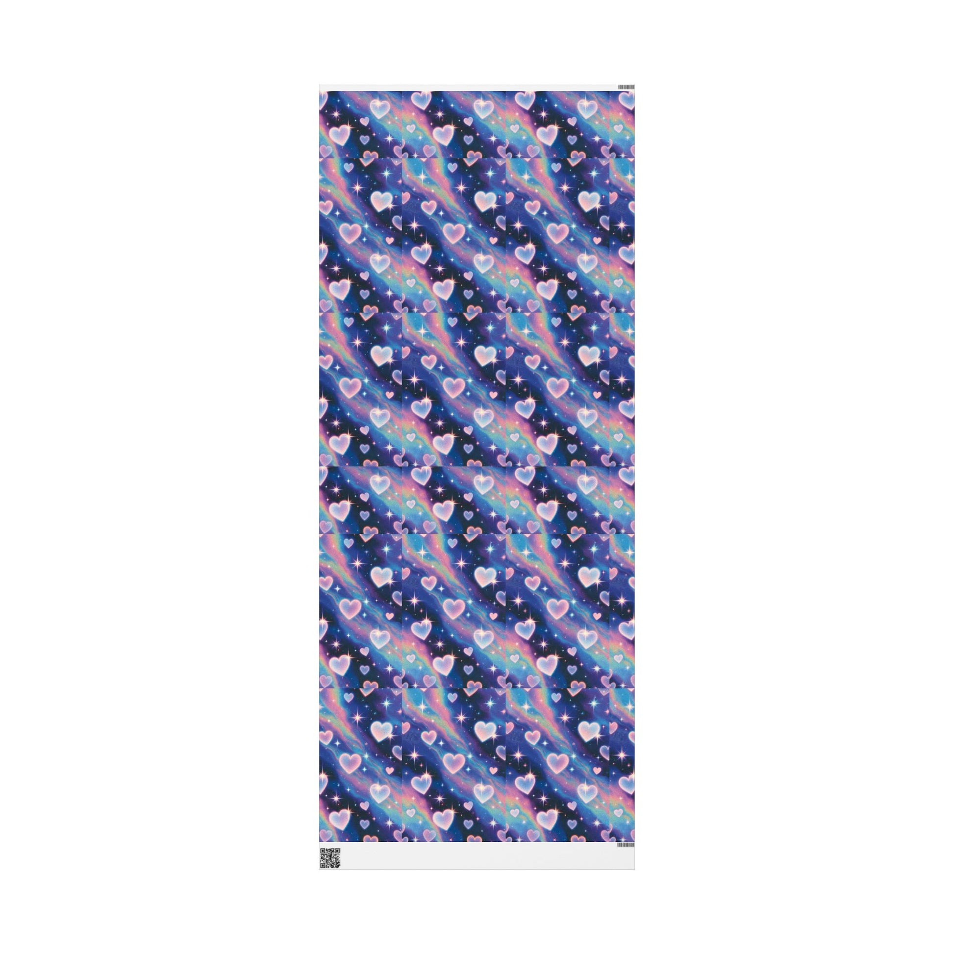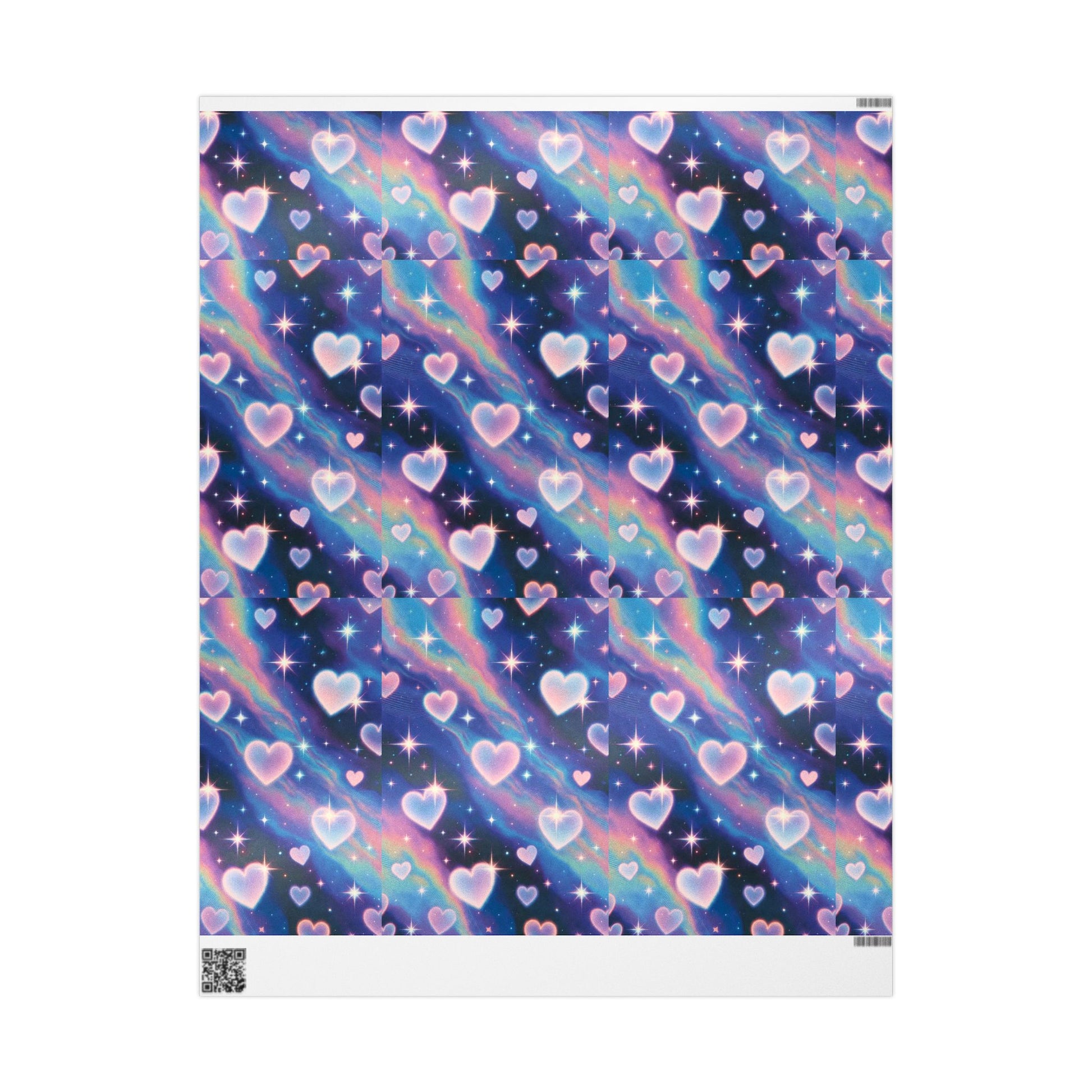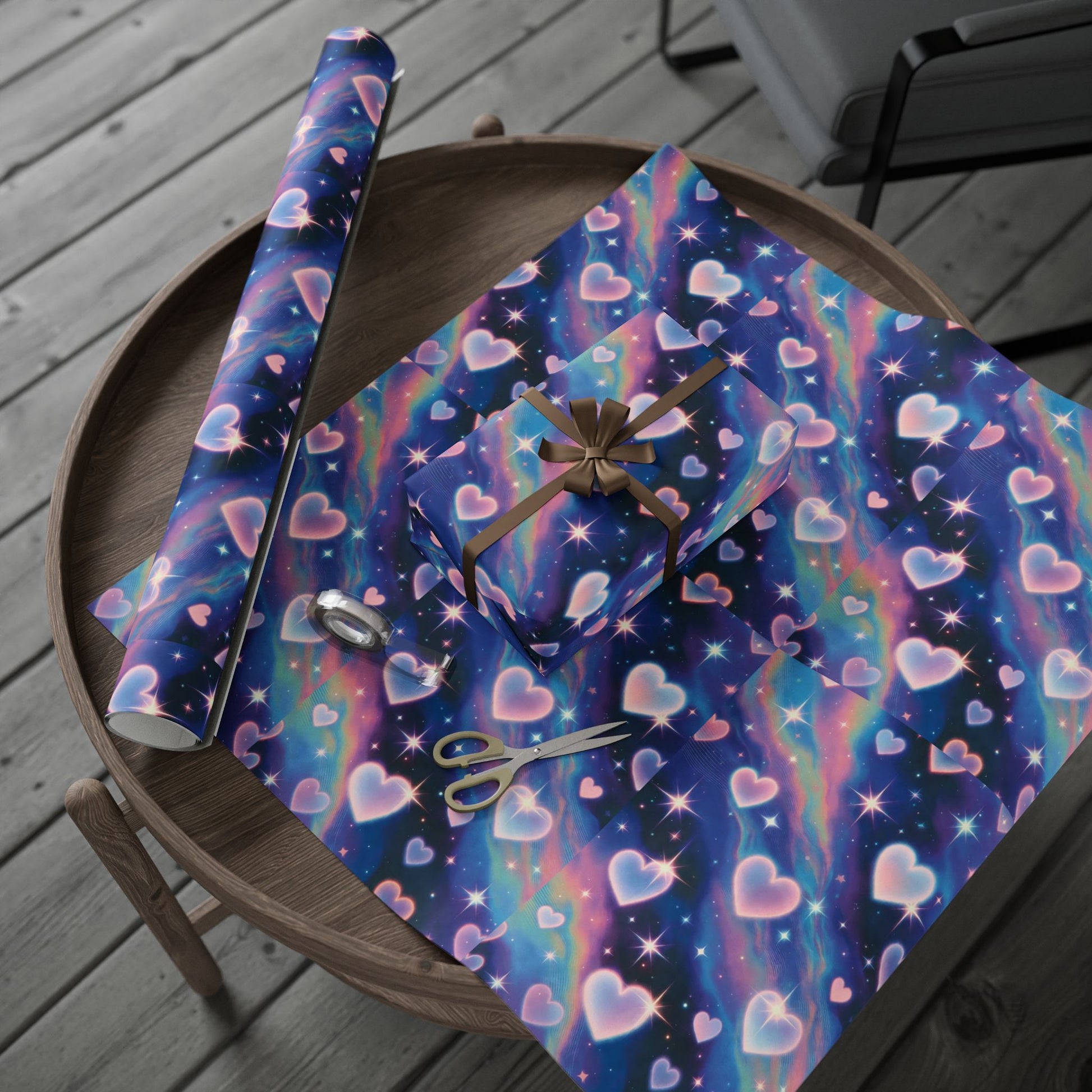 This glossy or matte wrapping paper brings soft iridescence and dreamy charm to every gift. Shimmering rainbow swirls, twinkling stars, and subtle heart motifs drift across a deep blue-violet field, creating a magical, otherworldly mood. The high-definition print on 90 gsm fine art paper feels substantial yet easy to fold, and the available sizes let you wrap small treats or long boxes without seams. Use it to add a playful, celestial touch to birthdays, celebrations, and cozy moments when you want the unwrapping to feel like a little reveal of wonder.