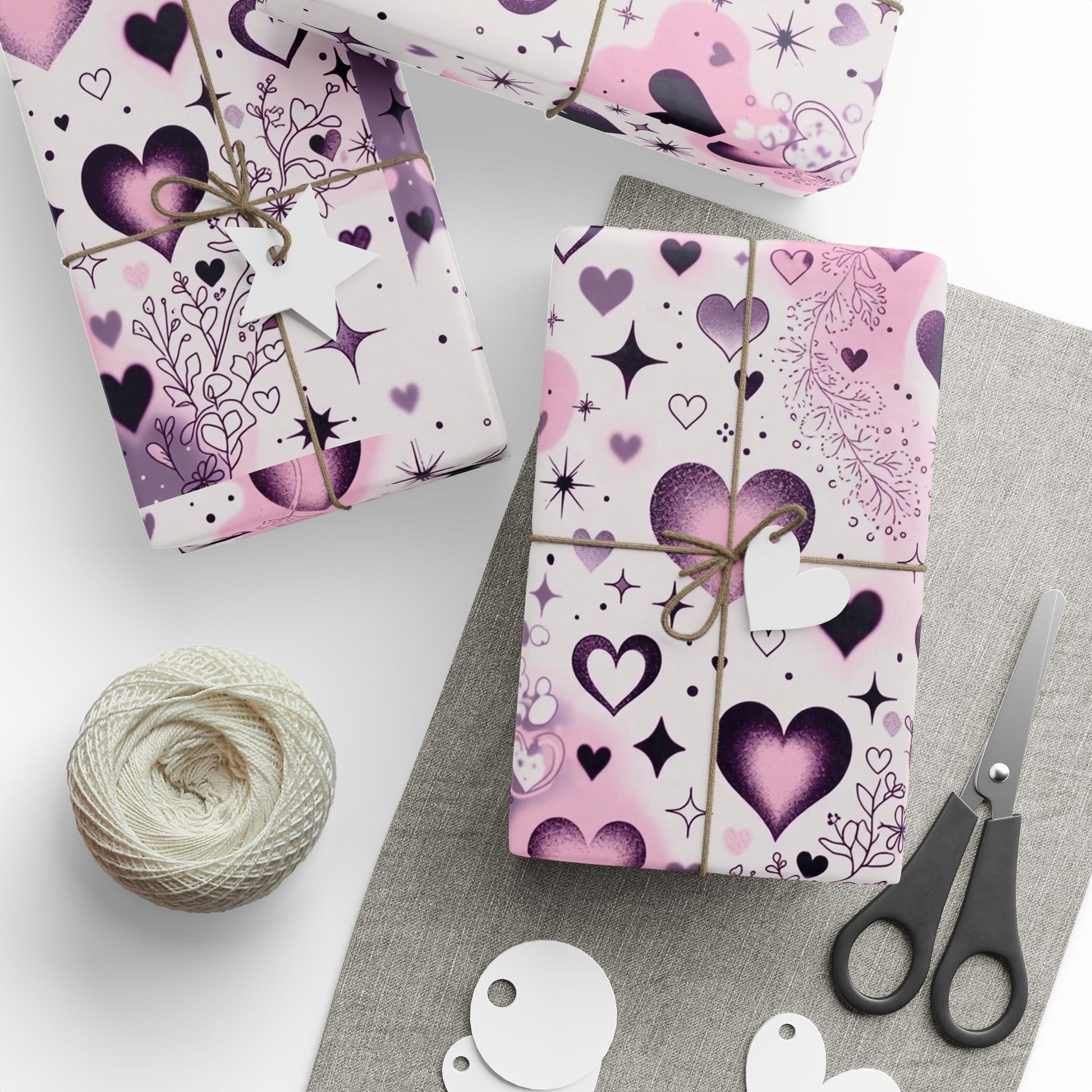 Soft, whimsical wrapping paper covered in hand-drawn hearts, stars, and playful doodles in rosy pink and lavender tones. The design brings a gentle, nostalgic energy—like passing a love note across a classroom desk or tucking a small surprise into a pocket. Lightweight yet substantial, the sheet lays smooth around boxes and bundles, and the choice of glossy or matte finish lets you tailor the final look: glossy for a brighter, candy-like sheen; matte for a softer, more refined feel. Small white trim with a barcode and QR code appears at the roll edges.